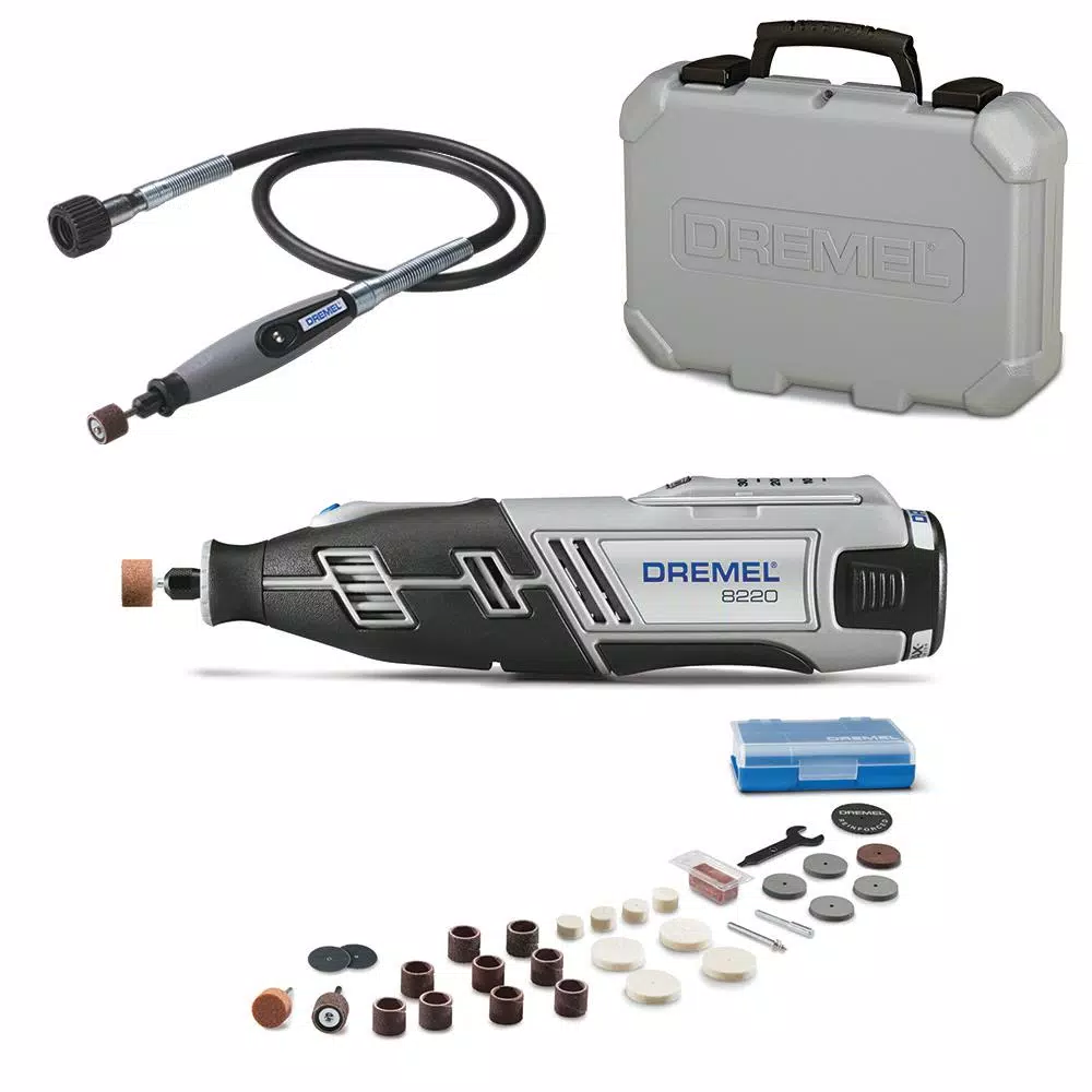 The Dremel Flex-Shaft Attachment is a must-have for all hobbyists and do-it-yourselfers. It has a flexible, 36 in. shaft with 5 in. bend radius you can easily attach to tools for an improved level of versatility for projects. It also has an integrated shaft lock button and quick-connect attach system. The Dremel 8220 variable-speed cordless rotary tool offers the highest performance and versatility of all Dremel cordless rotary tools. The strength of its motor facilitates maximum performance at all speed levels. The ability to use all current Dremel rotary tool accessories and attachments let the Dremel 8220 complete a wide range of projects. A slim ergonomic body provides a 360° grip zone for control in any position. Powered by 12-Volt MAX Lithium-Ion battery technology, the Dremel 8220 has a 33% longer run-time than the Dremel 8200 cordless rotary tool when cutting screws.