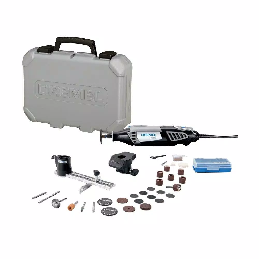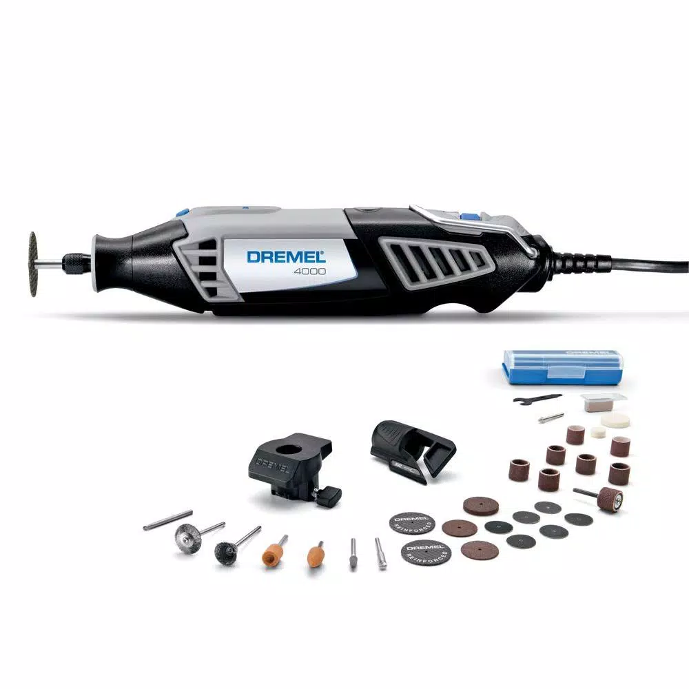 The Dremel 4000 variable speed rotary tool offers the highest performance and most versatility of all Dremel rotary tools. The increased strength of its motor plus electronic feedback circuitry enables consistent performance at all speed levels. Dremel 4000 can use all existing Dremel accessories and attachments plus high-performance attachments to complete the widest range of projects. A slim, ergonomic body provides a 360° grip zone for comfort and control in any grip position.