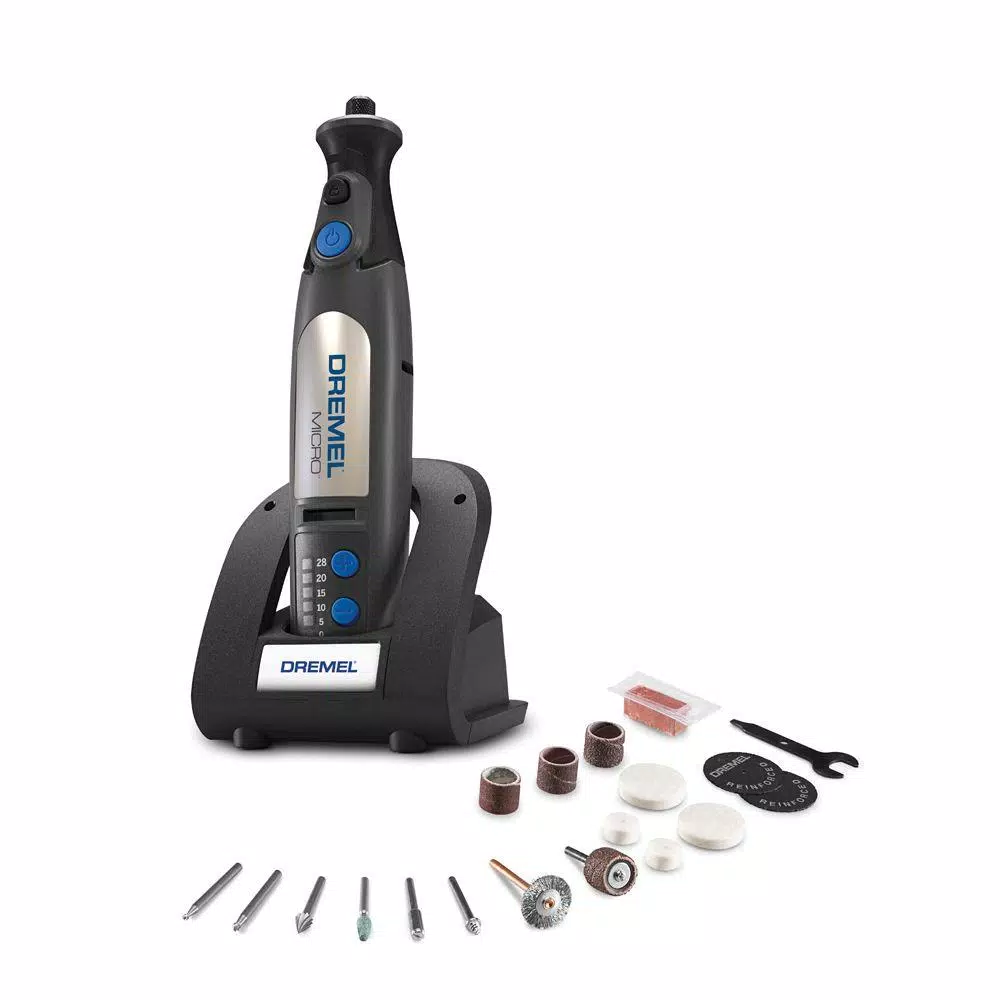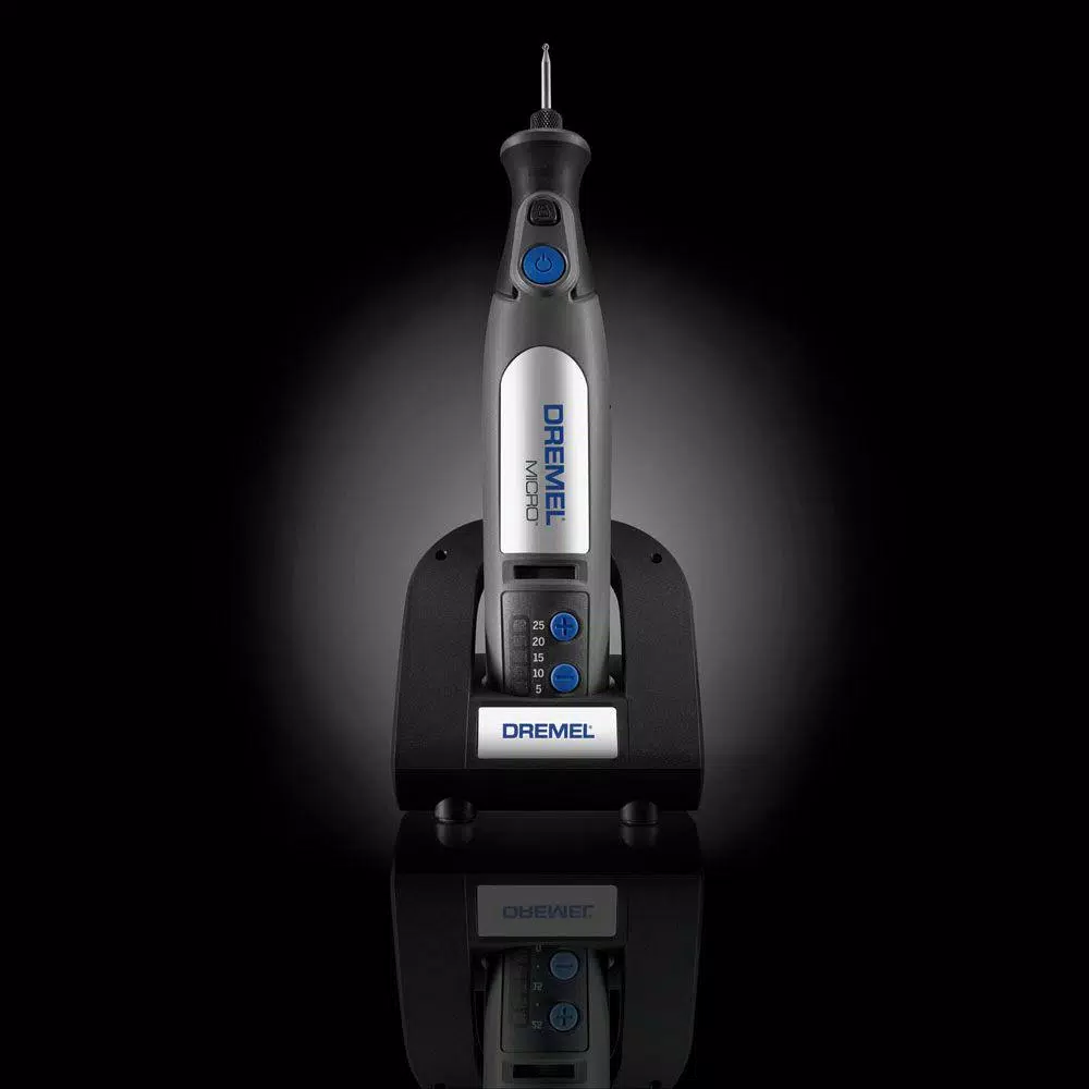 The Dremel Micro is the perfect combination of size, ergonomics and power that make it the ultimate tool for both precise and light duty DIY tasks. Designed to be held between the thumb and forefinger like a pencil, the Dremel Micro allows a grip that is close to the workpiece for superior maneuverability and control. To illuminate projects, the Dremel Micro has LED lights built uniquely into the nose cap to aid in vision and accuracy.
