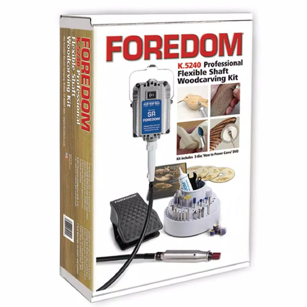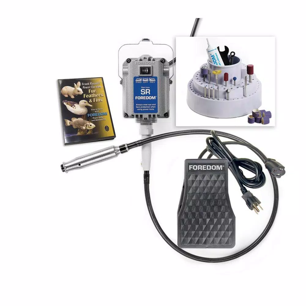 Foredom professional Woodcarving Rotary Tool Kit. This kit includes the Foredom SR Motor, Foot Pedal, H.44T Collet Style Hand-piece, and 31-piece assortment with 3/32 in., 1/8 in. and 1/4 in. shank accessories. It includes many unique items from Foredom including Purple Ceramic Sanding Bands, Typhoon Burs, Ceram Cut Blue Stones, steel cutters and burs, plated diamond point, split mandrel, 3M radial bristle discs, and lots more.