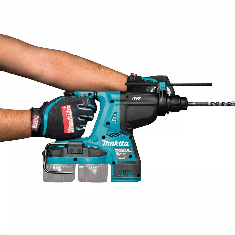 The Makita 18-Volt X2 LXT (36-Volt) Brushless 1-1/8 in. AVT Rotary Hammer is a cordless concrete solution that’s loaded with advanced engineering for maximum efficiency. Its powered by two 18-Volt LXT batteries (sold separately) and an efficient brushless motor for maximum power, speed and run-time for corded demands, without the cord. X2 LXT technology delivers up to 140 in. x 2-3/8 in. holes per charge when using two 18-Volt LXT 5.0 Ah batteries. For reduced vibration, its equipped with Anti-Vibration Technology (AVT). More than just a padded handle, AVT is an internal counterbalance that uses air pressure to move counterweight pistons in the opposite direction of the drive piston to actively reduce vibration. In addition, the vibration-absorbing back handle and side handle further reduce vibration. The result is a low vibration rating of only 9m/s, but with no compromise in performance: The efficient brushless motor delivers a full 2.3 ft./lbs. of impact energy, with 250 RPM to 980 RPM and 0 BPM to 5,000 BPM. The torque limiting clutch is engineered to prevent gear damage by automatically disengaging the gears if the bit binds, and constant speed control automatically adds power to the motor to maintain speed under load to complete the most demanding jobs. Additional performance features include a electric brake, variable speed dial, built-in LED light, and a retractable tool hook.