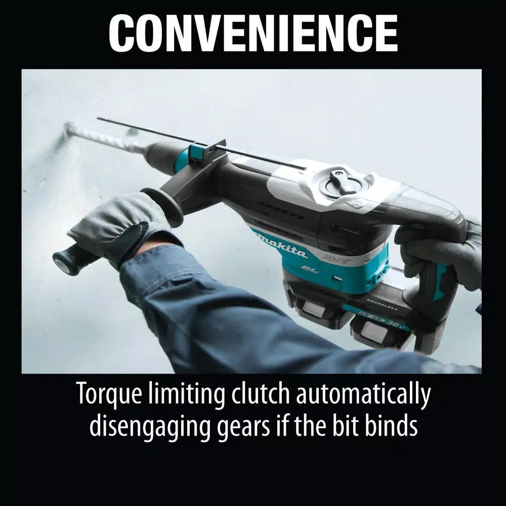 The Makita 18-Volt X2 LXT (36-Volt) Brushless 1-9/16 Advanced AVT Rotary Hammer with AWS is a cordless concrete solution thatโs loaded with advanced engineering for maximum efficiency. Its equipped with Auto-Start Wireless System (AWS) for wireless connectivity with an AWS-equipped dust extractor (sold separately) and features Advanced AVT for reduced vibration. Its powered by two 18-Volt LXT batteries and an efficient brushless motor for maximum power, speed and run-time for corded demands, without the cord. The XRH07PTU is engineered with Advanced Anti-Vibration Technology (AVT), a synchronized 3-component system for significantly less vibration. AVT is more than just a padded handle. The 3-component system includes an internal counterbalance that uses air pressure to move counterweight pistons in the opposite direction of the drive piston to actively reduce vibration. The result is a low vibration rating of only 5m/s, but with no compromise in performance: The efficient brushless motor delivers a full 8.4 ft./lbs. of impact energy, with 250 RPM to 500 RPM and 1,450 BPM to 2,900 BPM. For improved efficiency, its equipped with Auto-Start Wireless System technology. AWS utilizes Bluetooth technology for wireless communication between the tool and dust extractor (sold separately). When the trigger of the AWS-equipped XRH07PTU is engaged, the AWS-equipped dust extractor powers-up. When the trigger is released, the dust extractor powers-down.