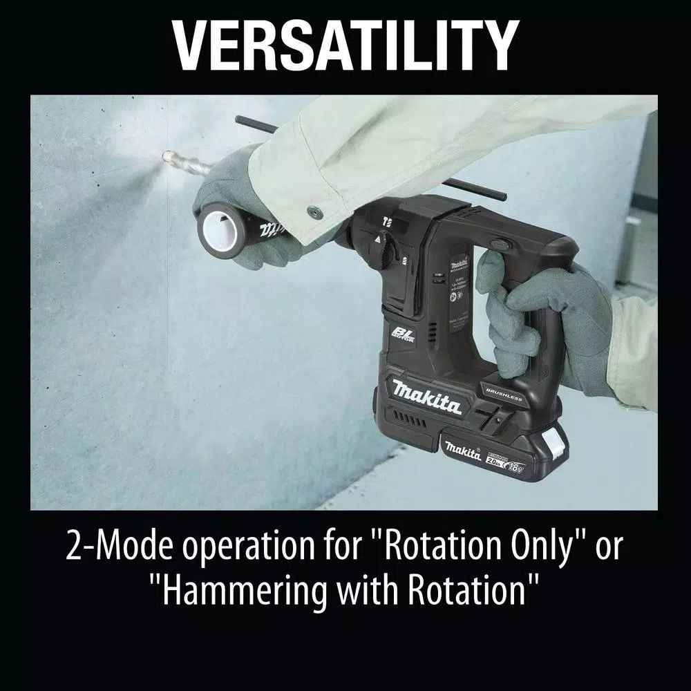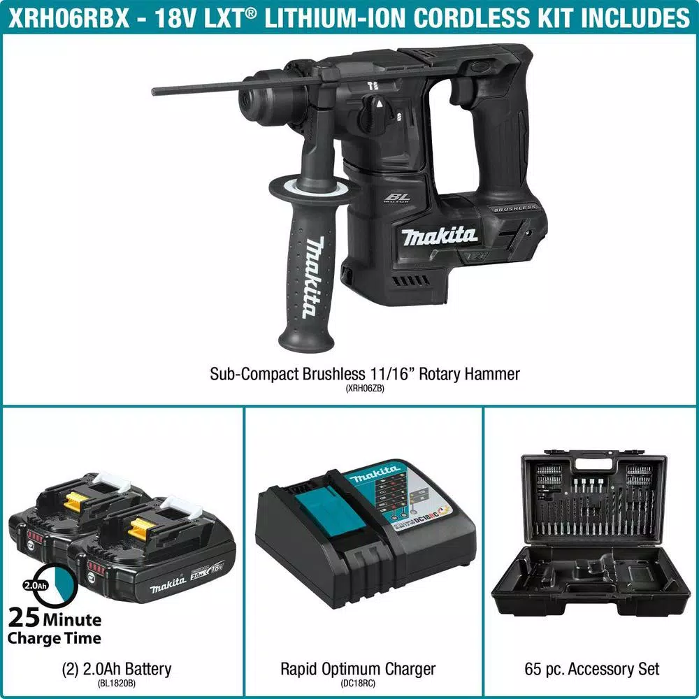 Makita created a new class in cordless with 18-Volt LXT Sub-Compact tools. Makita Sub-Compact gives users 12-Volt handling with 18-Volt performance and compatibility with the worlds largest 18-Volt cordless tool system. The 18-Volt LXT Sub-Compact Brushless 11/16 Rotary Hammer (accepts SDS-PLUS bits) is ideal for working in tight spaces and for overhead conditions. The XRH06RBX has an efficient Makita BL Brushless Motor for up to 50% longer run time, increased power and speed, and longer tool life. It has 2-mode operation for rotation only or hammering with rotation, with 0-680 RPM, 0-4, 800 BPM and 0.88 ft. lbs. / 1.2 Joules of impact energy for fast and efficient drilling. The compact size and lower weight mean reduced fatigue for operators, especially for overhead applications. Additional features include a vibration-absorbing handle that moves independently of the motor and hammer mechanism for increased operator comfort, as well as a variable speed trigger, built-in LED lights, and one-touch sliding chuck for easy bit changes. Its part of Makitas expanding 18-Volt LXT system, the worlds largest cordless tool system powered by 18-Volt Lithium-Ion batteries. Makita 18-Volt LXT batteries have the fastest charge times in their categories, so they spend more time working and less time sitting on the charger.