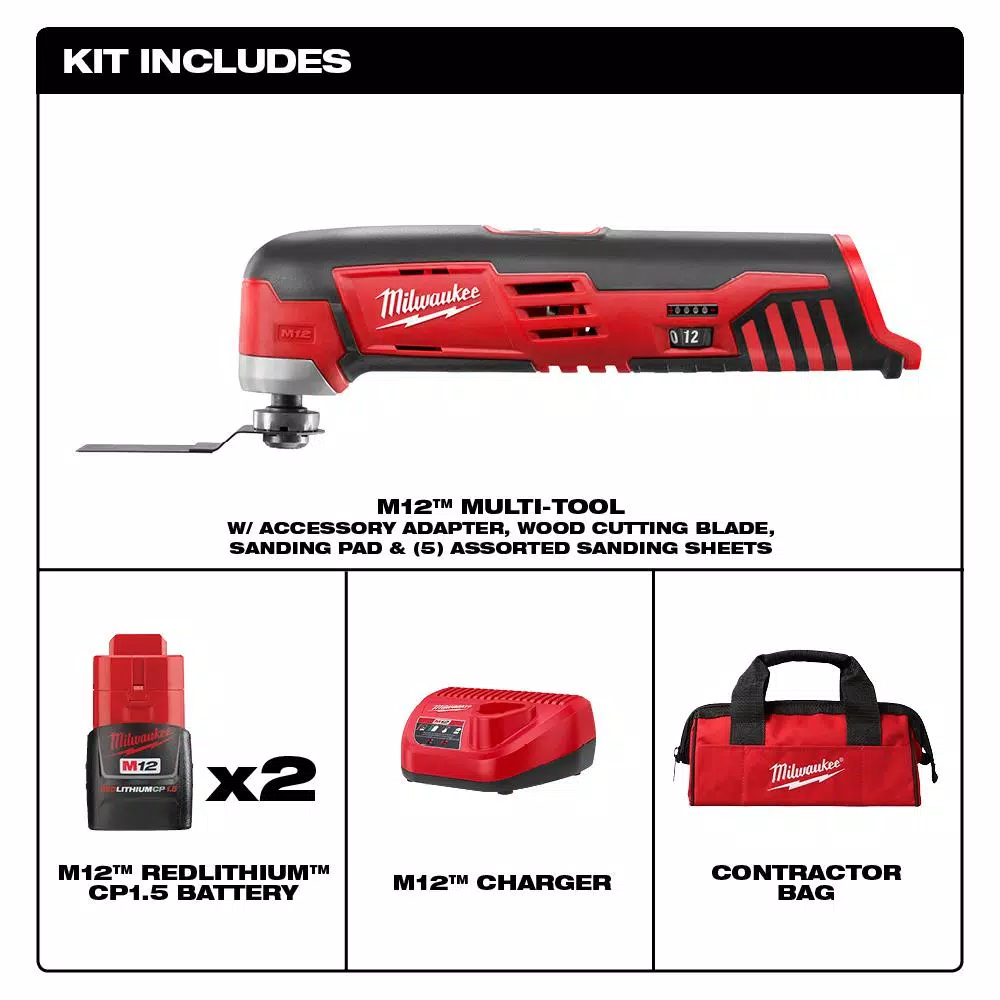 - Includes: (1) M12 Cordless Multi-Tool (Tool Only) (2426-20) (1) M12 REDLITHIUM CP1.5 Battery Pack (48-11-2401) (1) M12 Lithium-ion Battery Charger (48-59-2401)