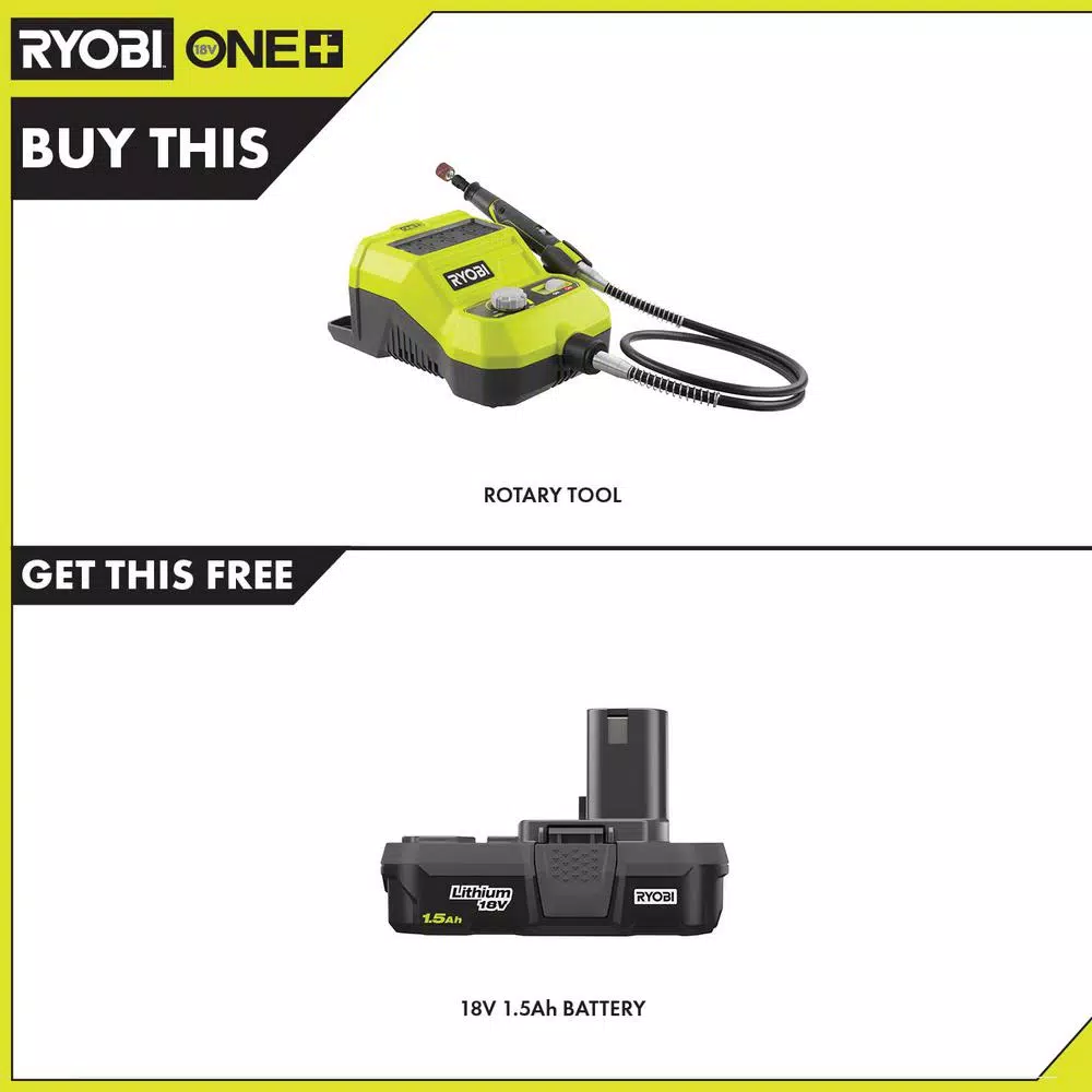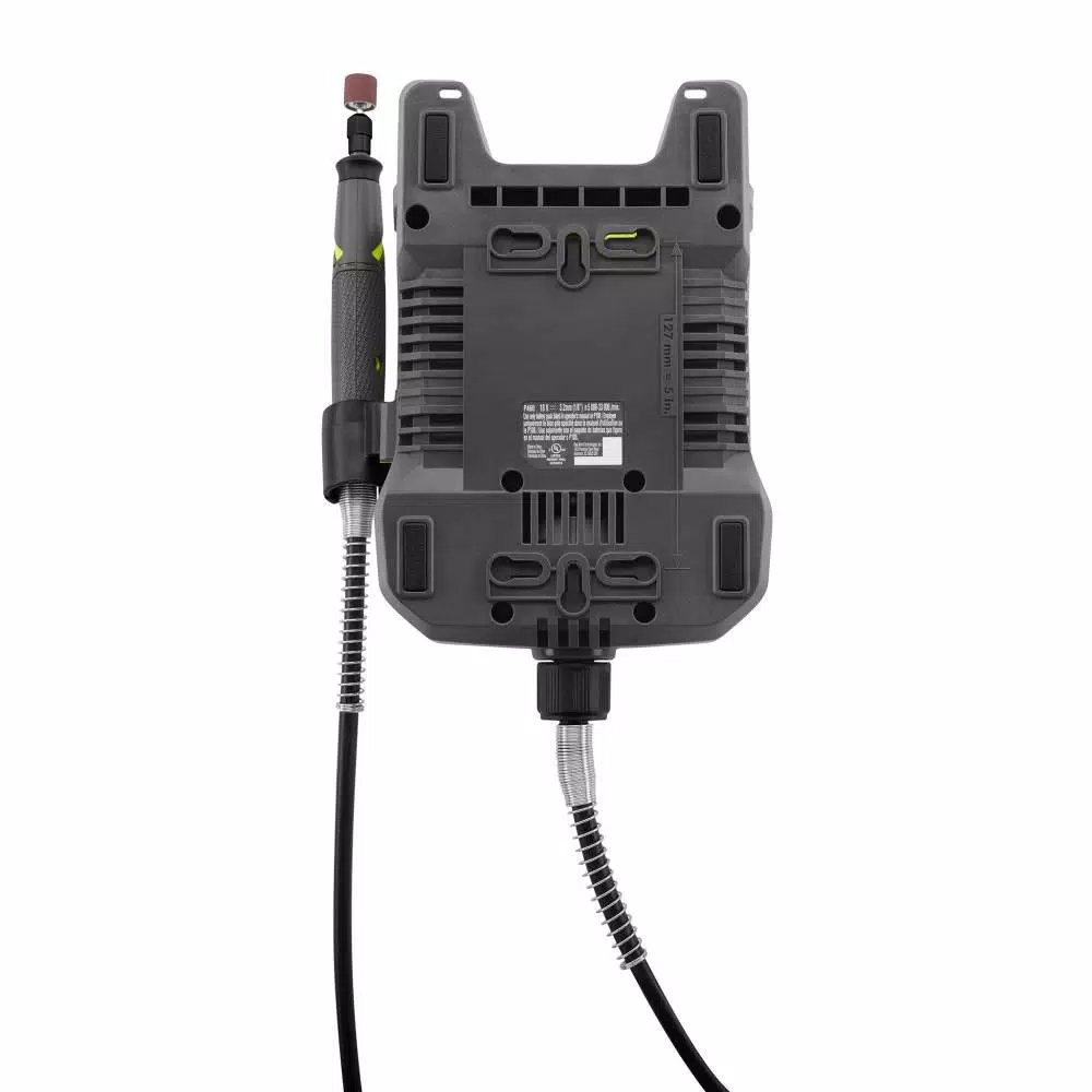 RYOBI introduces the 18-Volt ONE+ Cordless Rotary Tool with 1.5 Ah Compact Lithium-Ion Battery. A variable speed dial allows users to reach up to 34,000 RPM for enhanced performance. With 33 included accessories and on-board accessory storage, the Rotary Tool delivers convenience while completing a variety of applications. The 36 in. flexible shaft pen design maximizes precision and comfort and the 1/8 in. collet accepts most accessories. With rubber feet to reduce slipping and integrated hanging keyholes, the ONE+ Rotary Tool is easy to use and easy to store. The included battery features lithium-ion cells, providing the user with over 50% more runtime compared to the (P102) 18-Volt ONE+ Lithium-Ion 1.3 Ah Compact Battery. Featuring Extreme Weather Performance, this battery can withstand frigid weather conditions and is engineered to deliver fade-free power for maximum performance. Best of all, it is part of the RYOBI ONE+ System of over 175 cordless tools that all work on the same battery platform. Backed by the RYOBI 3-Year Manufacturer’s Warranty, this Rotary Tool includes a 36 in. flexible shaft, 33 grinding/cutting/sanding/polishing accessories, an accessory storage case, an 18-Volt ONE+ 1.5 Ah Compact Lithium-Ion Battery, and an operator’s manual. Charger sold separately.