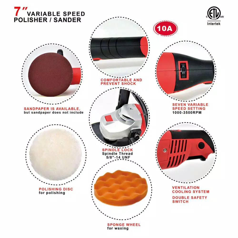 Polisher and sander with ergonomic design, designed for transport, has 6ft wire that allow you to work with greater movement. You can exchange hook and loop, sponge or polishing disc. You can polish flat surfaces such as tables or even vehicles depending on the accessory that use, has up to 7 speeds, each with different power. Our polisher have ETL to offer security and not suffer risks.