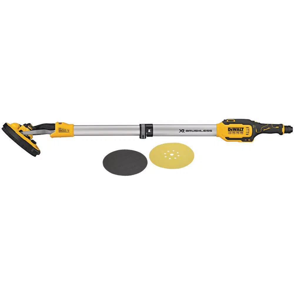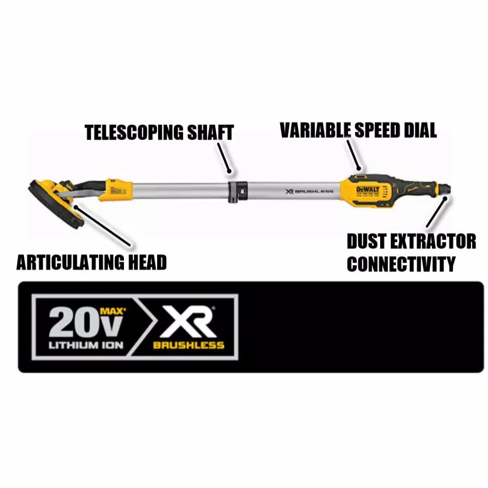 The brushless motor in this Cordless Drywall Sander increases runtime, durability and speed consistency. Its AirLock (TM) connection, for use with DEWALT dust extractors, delivers a quick, secure and tool-free connection to DEWALT Dust Extractors. The variable-speed dial for better control. The DCE800’s telescoping shaft and articulating head allow users to better reach their workspaces. To efficiently remove potentially harmful dust in the workplace, the tool is equipped with Wireless Tool Control for pairing with compatible DEWALT dust extractors.