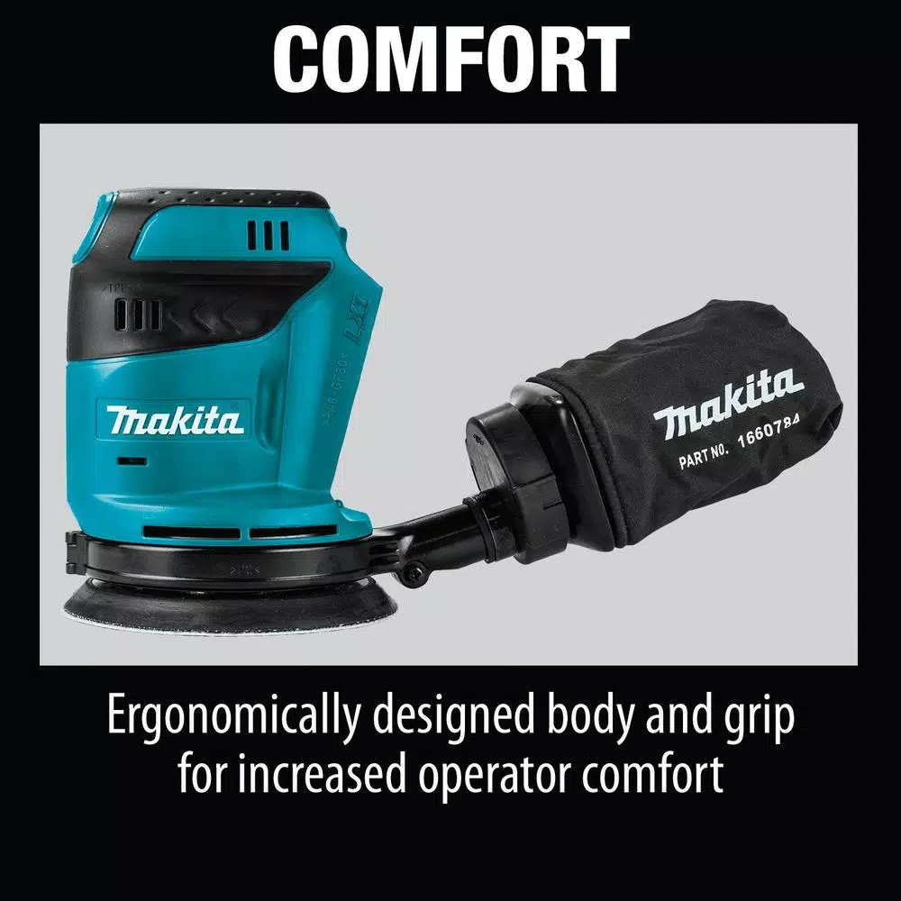 The 18-Volt LXT Lithium-Ion Cordless 5 in. Random Orbit Sander (model XOB01Z, tool only) delivers increased efficiency and mobility to woodworkers. The XOB01Z features 3-speed settings, superior ergonomics and up to 40 minutes of run time on a single charge (battery sold separately). Match the speed to the application with 3-speed settings (7,000/9,500/11,000 OPM), which are easily changed with a 1-touch electronic control switch. The large 1/8 in. random orbit action is engineered for efficient sanding, fast material removal and a swirl-free finish. The pad brake reduces free-spin for improved overall finish and a control system regulates pad speed at start-up. The XOB01Z uses quick-change 5 in. (8-hole) hook-and-loop abrasive paper for increased versatility. It’s part of Makita’s expanding 18-Volt Lithium-Ion series, the world’s largest cordless tool line-up powered by an 18-Volt Lithium-Ion slide-style battery. Makita 18-Volt Lithium-Ion batteries have the fastest charge times in their categories, so they spend more time working and less time sitting on the charger. For improved tool performance and extended battery life, Makita created Star Protection Computer Controls. Star Protection is communication technology that allows the Star Protection-equipped tool and battery to exchange data in real time and monitor conditions during use to protect against overloading, over-discharging and overheating.