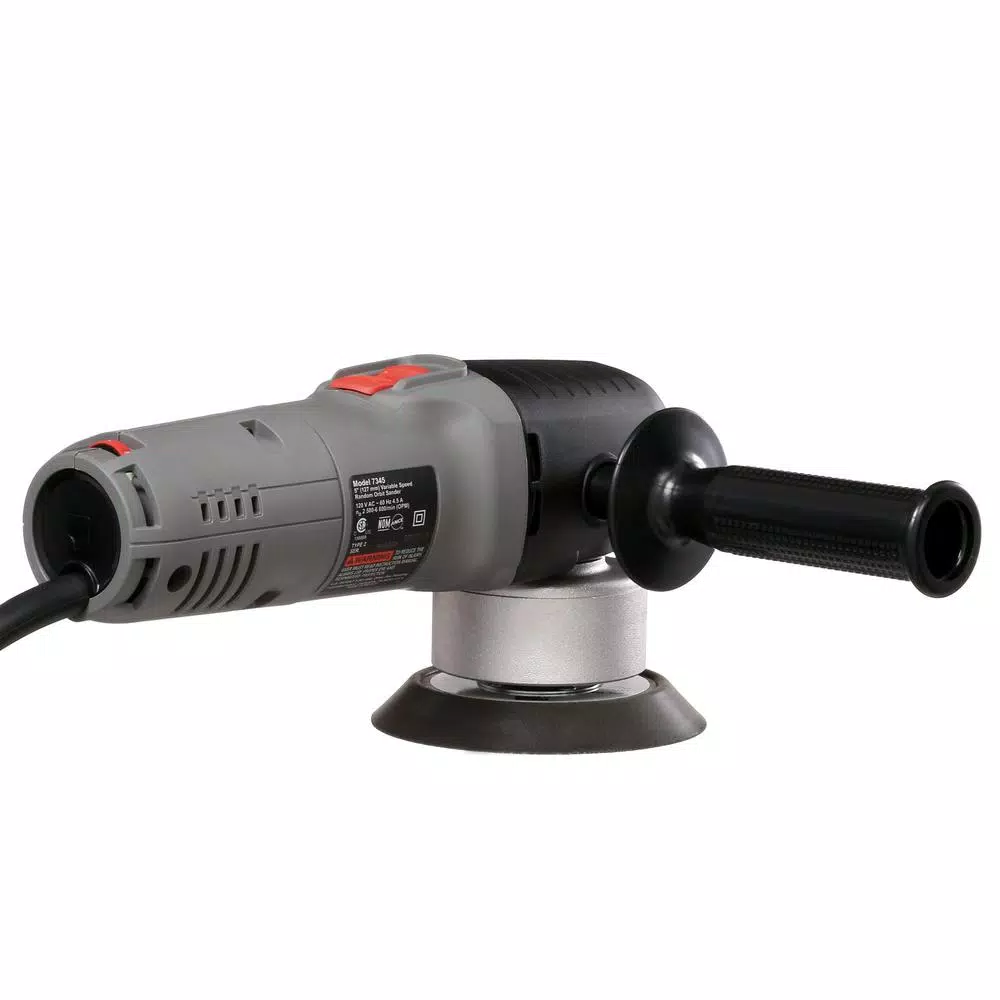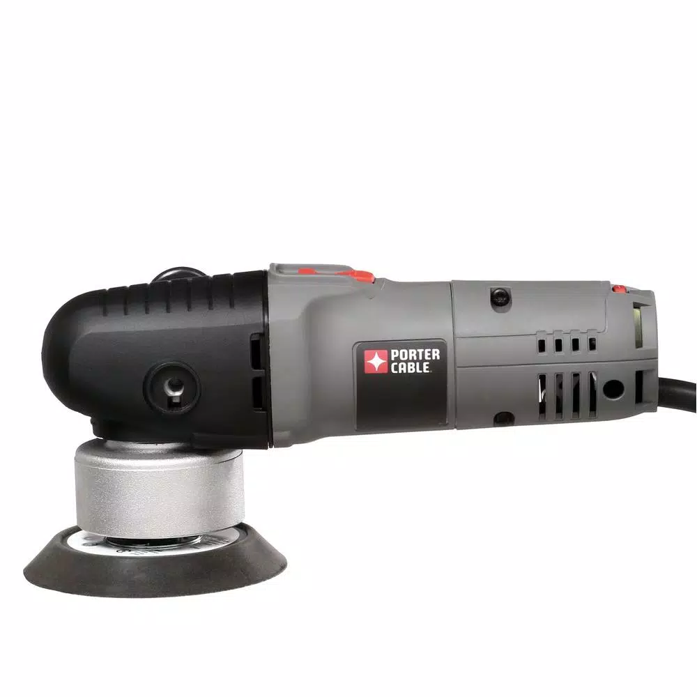 The Porter-Cable 5 in. right angle random orbit sander is well-suited for woodworking, remodeling, flooring and trim sites where everything from bulk stock removal to fine sanding are required to knock down rough stock, removing finishes and solid surface preparation are required. The 4.5 AC-only electronic variable speed motor delivers 2,500-6,800 OPM enabling user to match sanding disc-speed to work and material. The unit accepts 5 in. adhesive backed sandpaper. Ninety-day money back guarantee, 3 year limited warranty, 1 year free service contract.