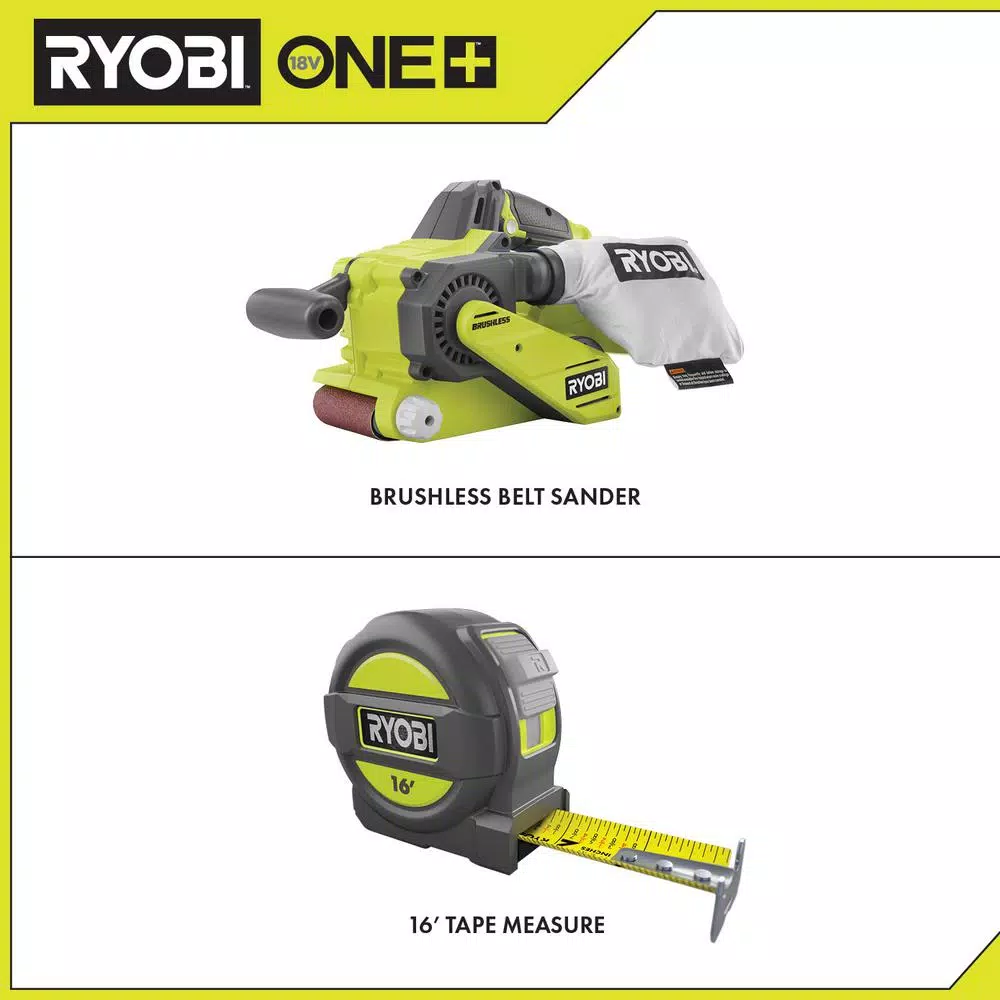 RYOBI introduces the 18-Volt ONE+ Cordless Brushless 3 in. x 18 in. Belt Sander with Dust Bag and 80-Grit Sanding Belt with 16 ft. Tape Measure. The brushless motor produces speeds of up to 850 FPM. With a low-profile design and a tool-free 5-position pommel handle, this sander is able to get into tight spaces while providing a more comfortable and customizable experience. Additional features include tool-free belt tracking and lock-on switch to maximize control and convenience while you work. Best of all, it’s a part of the RYOBI ONE+ System of over 175 Cordless Tools that all work on the same battery platform. Backed by the RYOBI 3-Year Manufacturer’s Warranty, this 18-Volt ONE+ Brushless Belt Sander includes a dust bag, an 80-grit sanding belt, and an operator’s manual. Battery and charger sold separately. The 16 ft. Tape Measure with Over mold and Wire form Belt Clip features a measuring range of 16 ft., making it perfect for all of your projects. Its reinforced rubber over mold housing fits comfortably in your hand while also making it impact resistant and heavy duty. The blade features fractions markings for superior accuracy and a nylon coating for wear resistance and durability. it also features an Accu-Slide hook that automatically adjusts for inside and outside measurements. The wire form belt clip reduces belt/pocket fraying and helps keep your tape measure within reach. This tape measure is backed by a RYOBI Limited Lifetime Warranty and includes a belt clip.