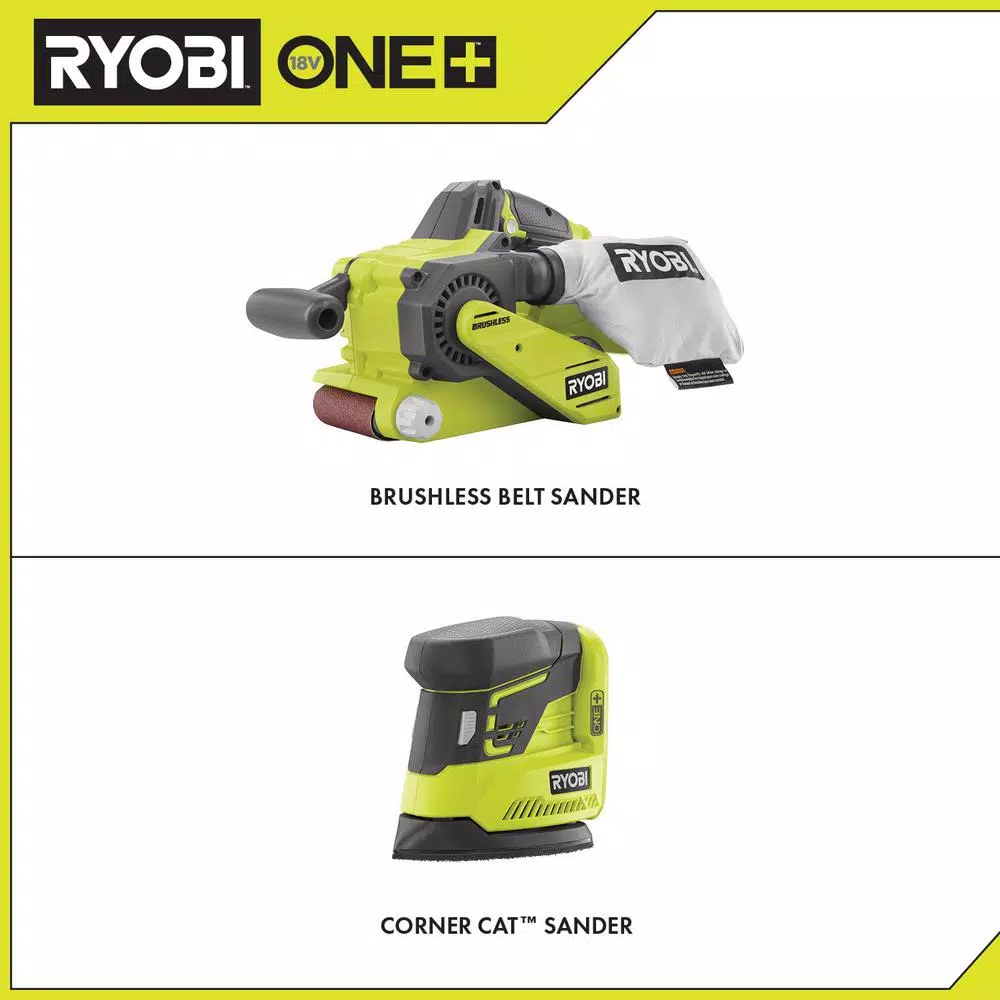 RYOBI introduces the 18-Volt ONE+ Cordless Brushless 3 in. x 18 in. Belt Sander with Dust Bag and 80-Grit Sanding Belt and 18-Volt ONE+ Cordless Corner Cat Sander with Sample Sandpaper (Tools Only). The brushless motor in the Belt Sander produces speeds of up to 850 FPM, providing true corded performance with cordless convenience. With a low-profile design and a tool-free 5-position pommel handle, this sander is able to get into tight spaces while providing a more comfortable and customizable user experience. Additional features include tool-free belt tracking and a lock-on switch to maximize user control and convenience while you work. The 18-Volt ONE+ Corner Cat Finish Sander provides a great solution for smooth, swirl-free finishes for your sanding projects. This tool features a unique shape that allows sanding in tight spaces while delivering 11,000 orbits per minutes (OPM) for efficient stock removal. This unit is 23% more compact compared to the previous model (P400) and includes sample sandpaper to get you started. Best of all, it is part of the RYOBI ONE+ System of over 175 Cordless Tools that all work on the same battery platform. Backed by the RYOBI 3-Year Manufacturer’s Warranty, this kit includes the ONE+ Brushless Belt Sander includes a dust bag, an 80-grit sanding belt, the 18-Volt ONE+ Corner Cat Finish Sander with sample sandpaper, and operator’s manuals. Battery and charger sold separately.