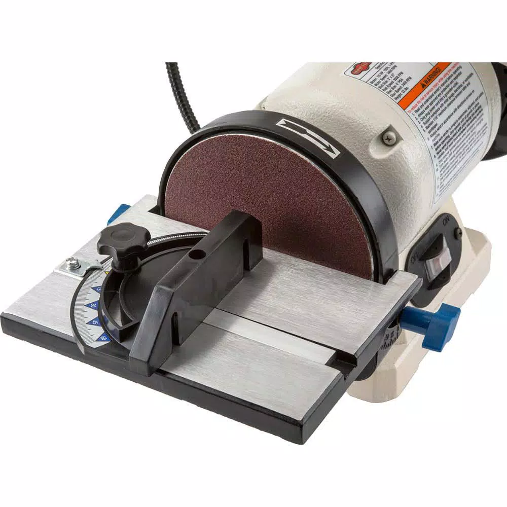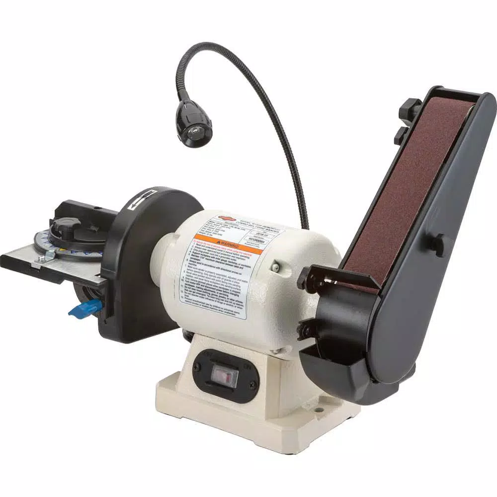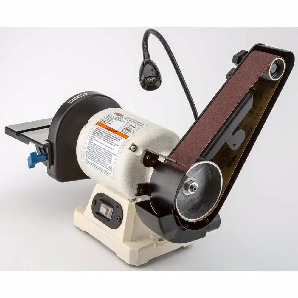 This Benchtop Combination Belt/Disc Sander is ideally suited for wood shaping, finishing or sharpening tasks. The 6 in. disc features a fully adjustable cast aluminum table, including a miter gauge for accurate angle sanding. The 2 in. x 27 in. belt sander has an adjustable support table for precision sharpening and a 5 in. L platen for support when sanding larger pieces.