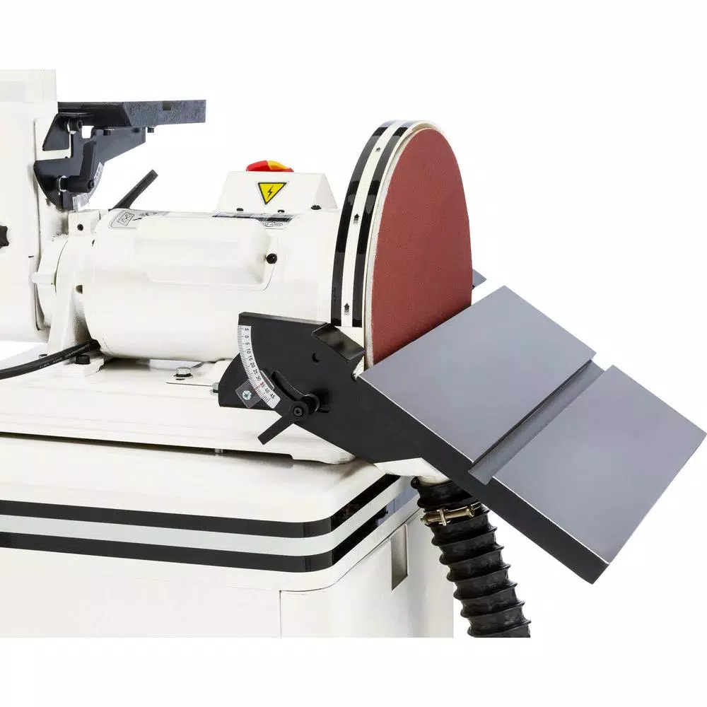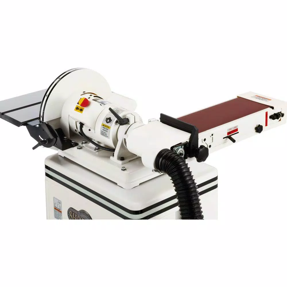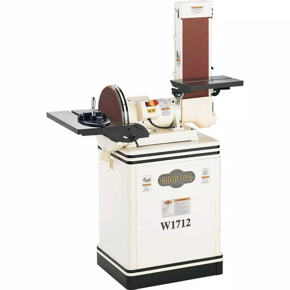 This Heavy-Duty Combination Sander uses a 6 in. x 48 in. belt, a 12 in. disc and a 1-1/2 HP motor to tackle your tougher sanding operations. Unlike many belt-driven sanders that require adjustments, the Shop Fox W1712 uses a direct ball bearing drive from the motor to the sanding disc and belt to deliver a maintenance and vibration free positive torque flow. For increased sanding versatility and control, both cast iron tables accept the miter gauge.