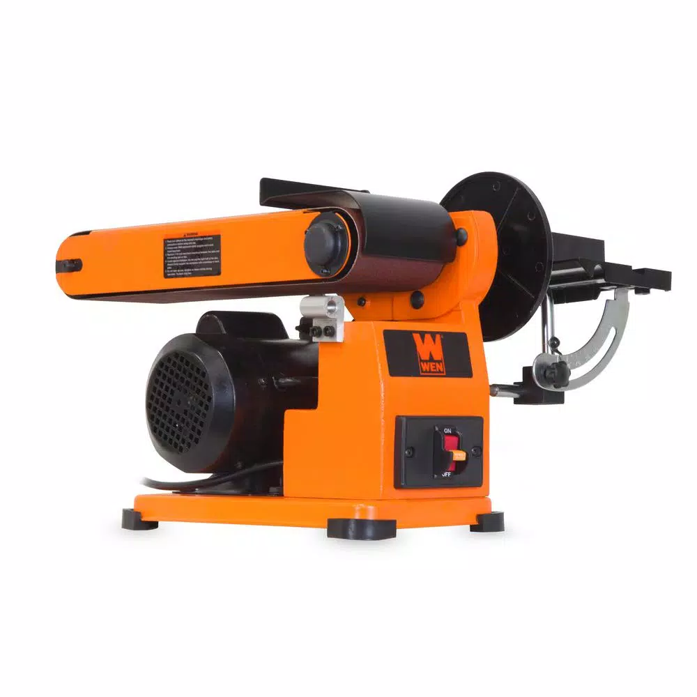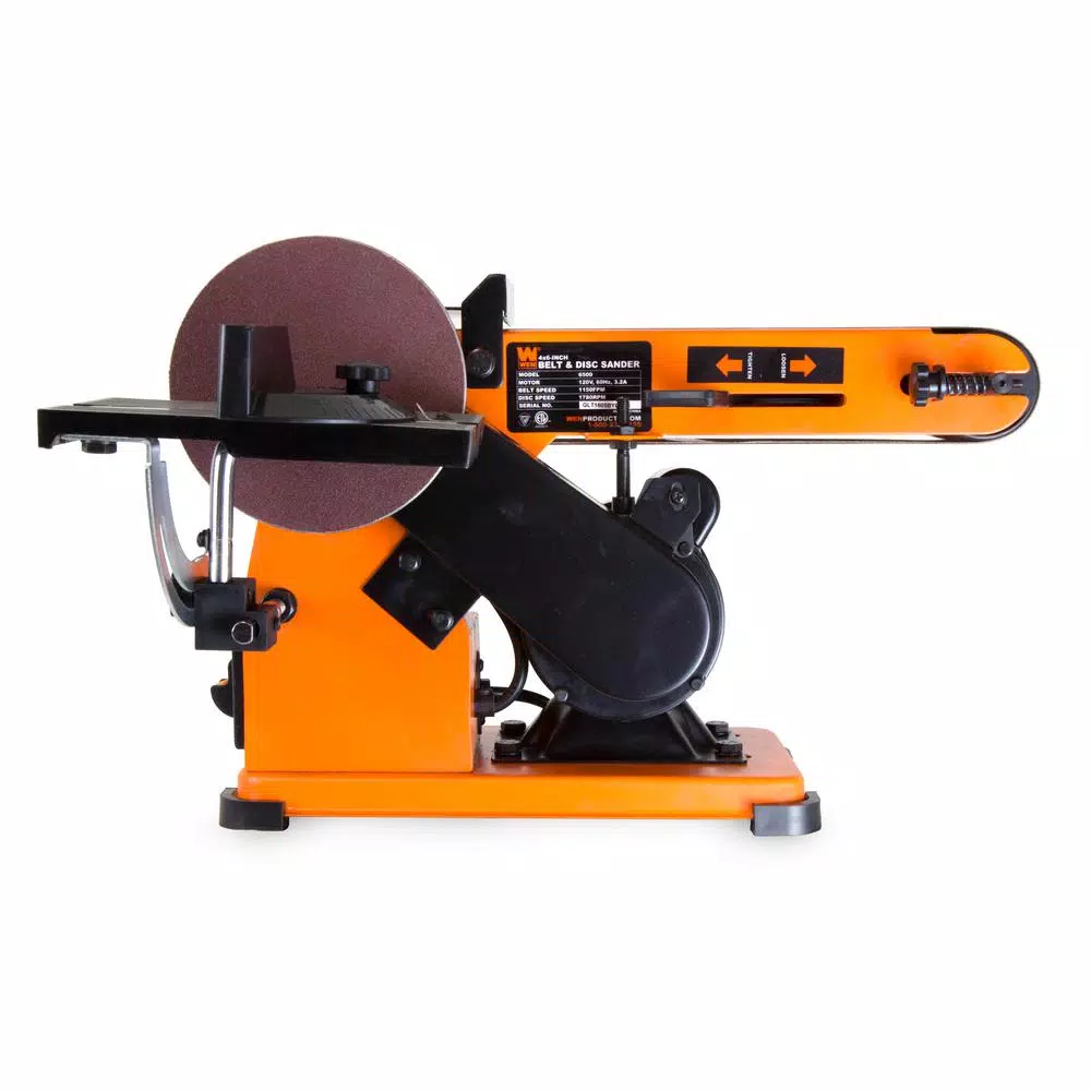 Remember when you needed a versatile and reliable sander. The WEN Steel Frame Belt Disc Sander sands, smooths and deburrs jagged edges and splinters on your wood and lumber. With a 3.2 Amp motor, users should anticipate speeds of up to 1150 ft. per minute. Changing the spacious 4 in. x 36 in. belt is a breeze, giving you the power to switch sand paper grits quickly and easily. The belt also tilts anywhere from 0Β° to 90Β° to accommodate the needs of your particular work piece. Combine this with the steel base and body for a versatile sander that makes transportation and storage easier than ever. With all of this in addition to the 6 in. side disc, youβll have the capacity to sand whatever your heart desires. A sturdy work table accompanies the disc to provide a reliable source of support for your work pieces. This package also includes an 80-grit sanding disc, an 80-Ggrit sanding belt and a miter gauge for precise sanding on angled edges along with a stop bar for maximum belt safety and control. And because this is a WEN Product, your purchase comes backed by a 2-year warranty, a nationwide network of skilled service technicians and a helpful customer phone line all to make sure that you remember WEN.